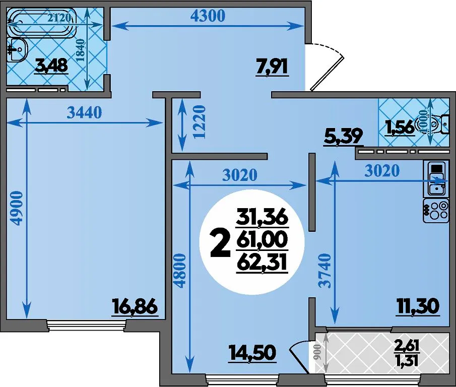 2-комнатная квартира 62.31м2 в ЖК Восточный, №117