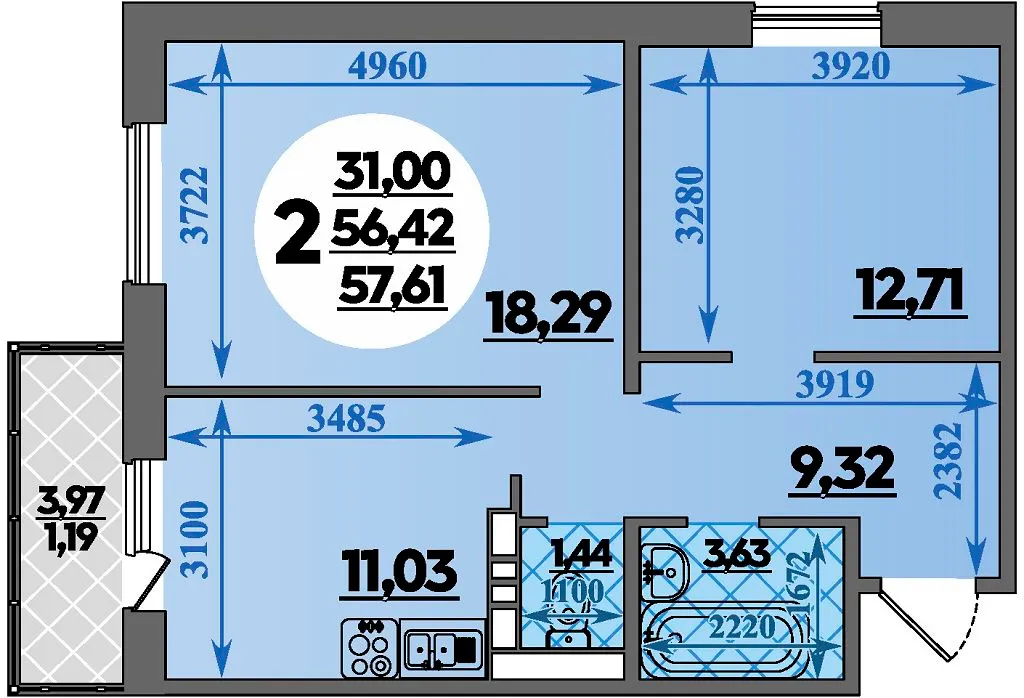 2-комнатная квартира 57.61м2 в ЖК Суворовский, №077