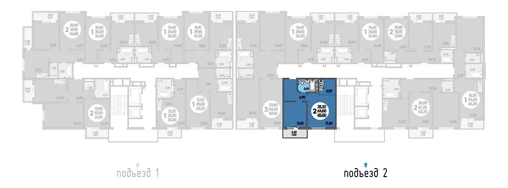 2-комнатная квартира 45.00м2 в ЖК Парк у дома, №155