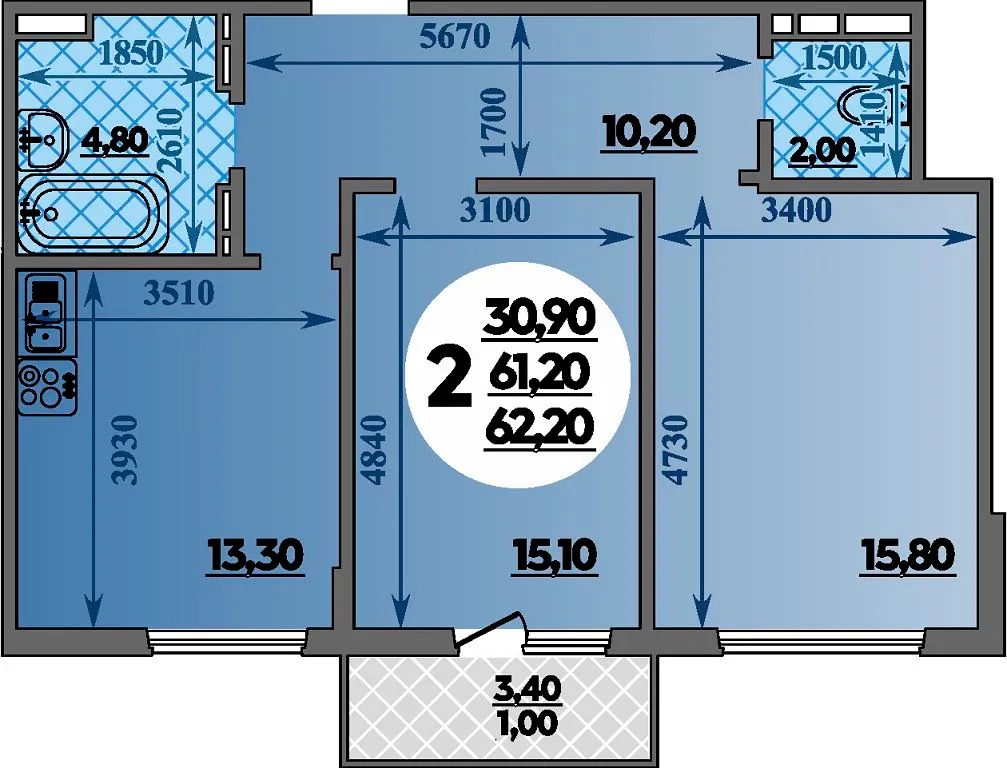 2-комнатная квартира 62.20м2 в ЖК Парк у дома, №154