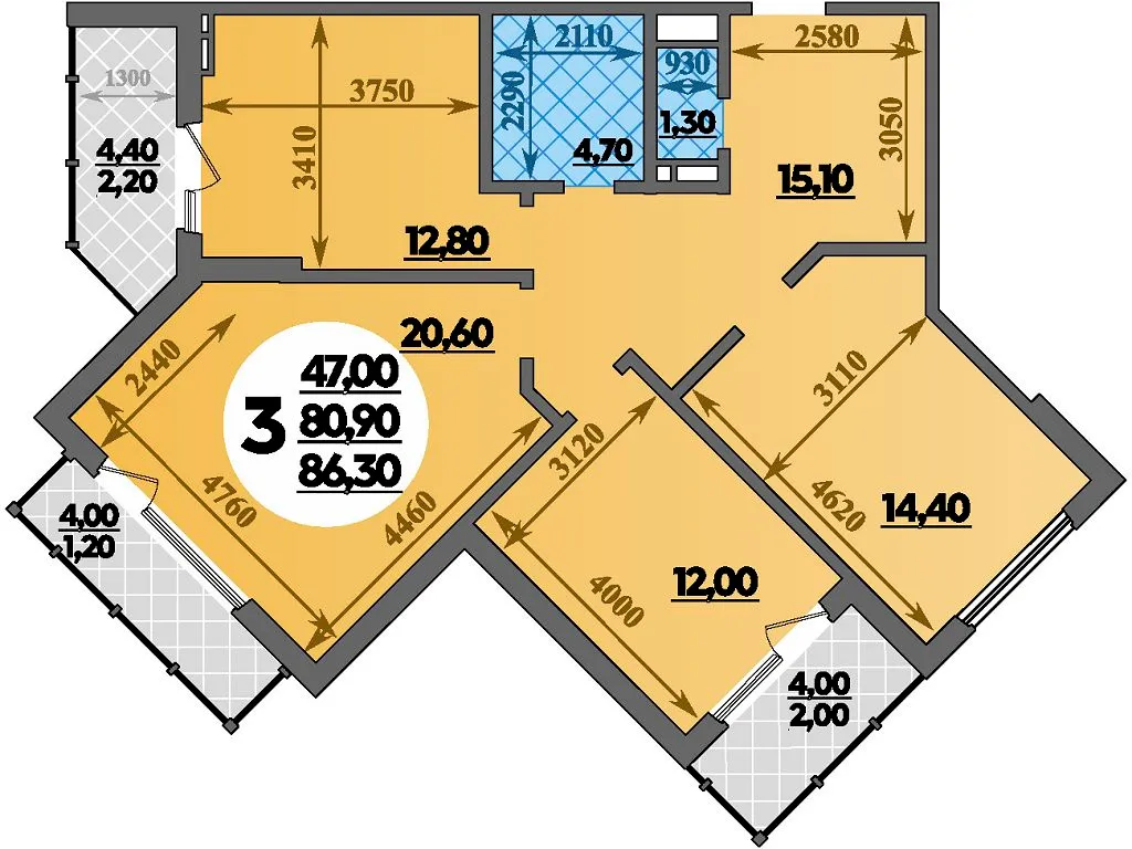 3-комнатная квартира 86.30м2 в ЖК Парк у дома, №087