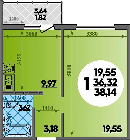 1-комнатная квартира 38.14м2 в ЖК Суворовский, №055