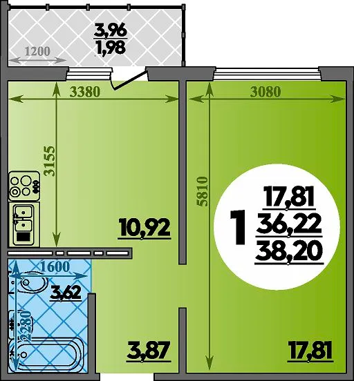 1-комнатная квартира 38.20м2 в ЖК Суворовский, №173