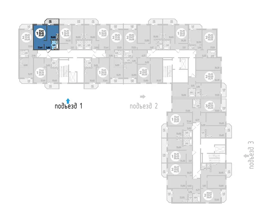1-комнатная квартира 37.49м2 в ЖК Молодежный 2, №045