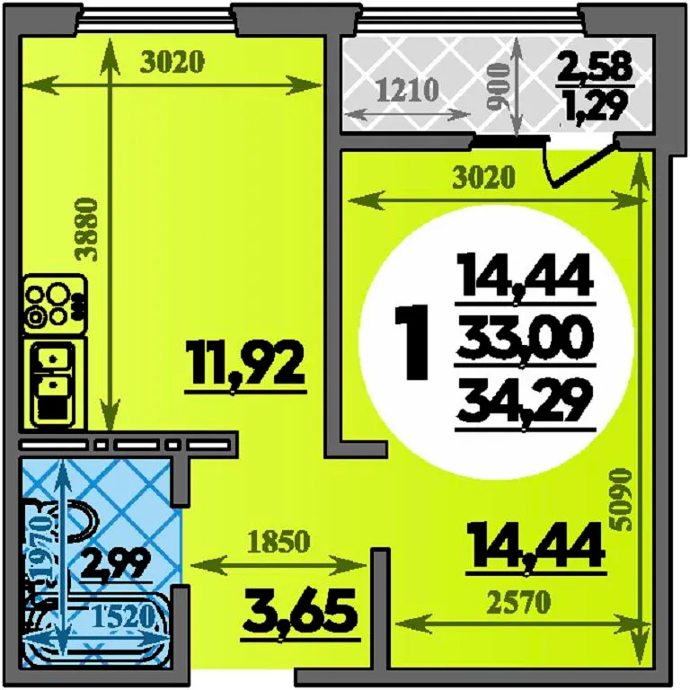 1-комнатная квартира 34.29м2 в ЖК Молодежный 2, №006