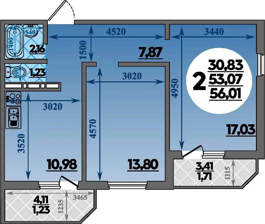2-комнатная квартира 56.01м2 в ЖК Молодежный 2, №025