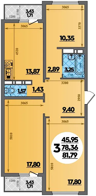 3-комнатная квартира 81.79м2 в ЖК Суворовский, №030