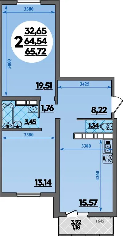2-комнатная квартира 65.72м2 в ЖК Предгорье Лаго-Наки, №173