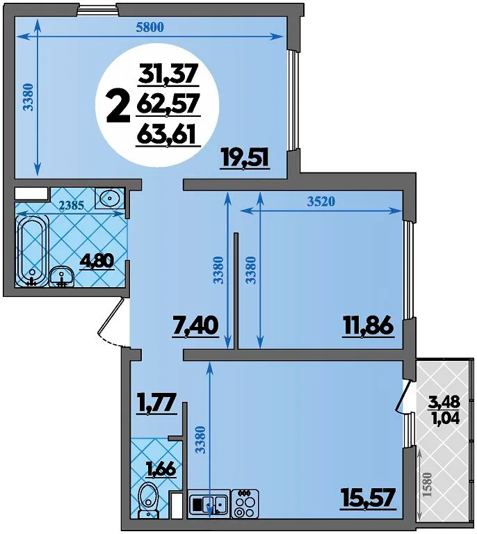 2-комнатная квартира 63.61м2 в ЖК Предгорье Лаго-Наки, №097