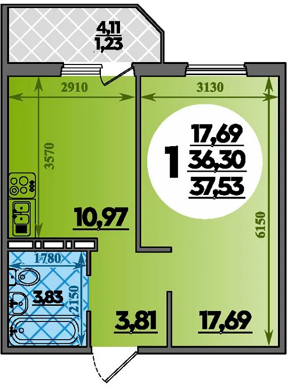 1-комнатная квартира 37.53м2 в ЖК Южная Долина, №082