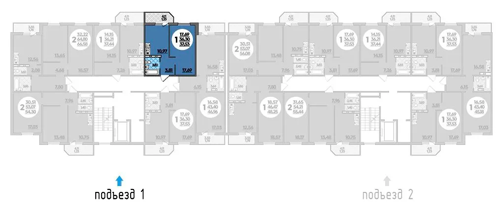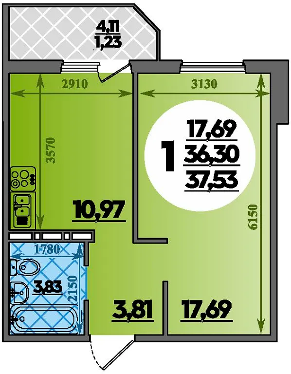 1-комнатная квартира 37.53м2 в ЖК Южная Долина, №046