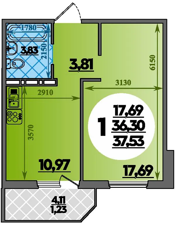 1-комнатная квартира 37.53м2 в ЖК Южная Долина, №018