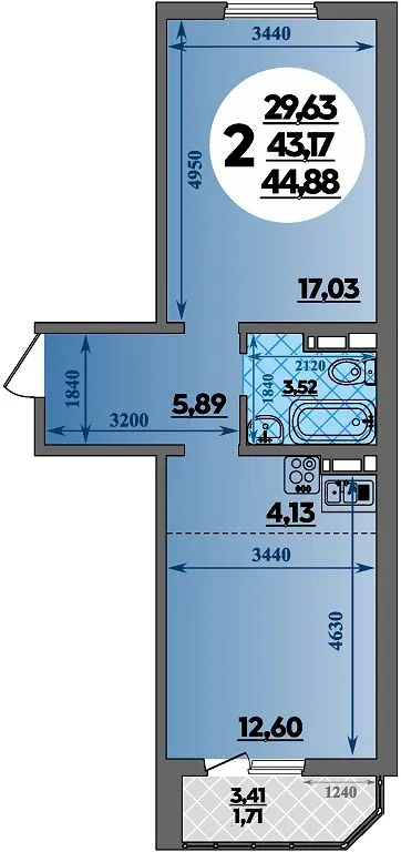 2-комнатная квартира 44.88м2 в ЖК Суворовский, №009