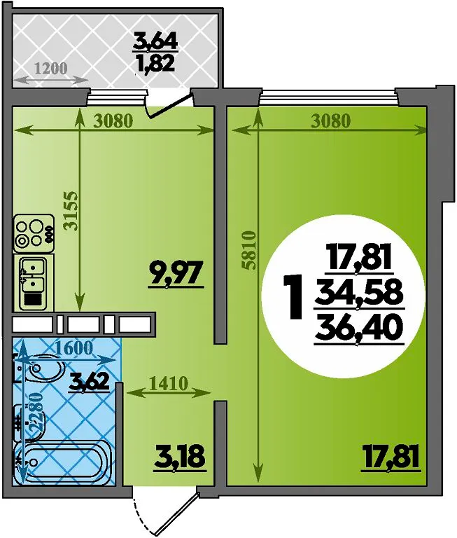 1-комнатная квартира 36.40м2 в ЖК Суворовский, №047