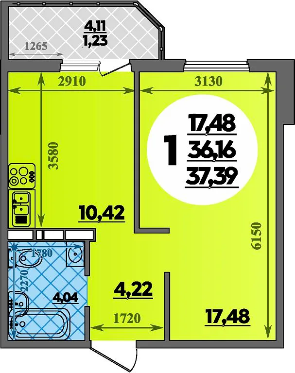 1-комнатная квартира 37.39м2 в ЖК Суворовский, №166