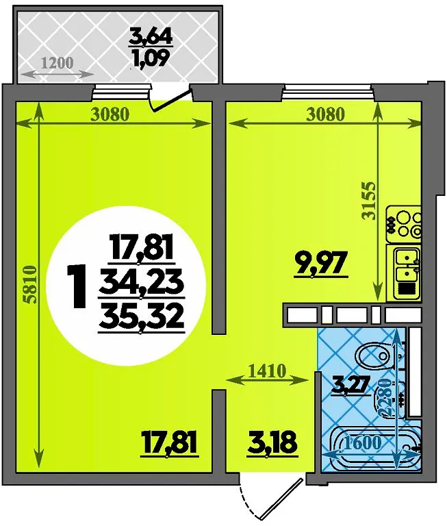 1-комнатная квартира 35.32м2 в ЖК Суворовский, №204