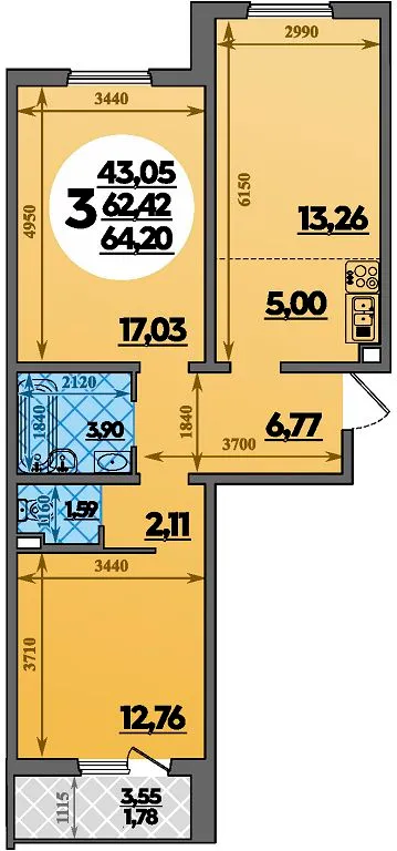 3-комнатная квартира 64.20м2 в ЖК Молодежный 2, №058