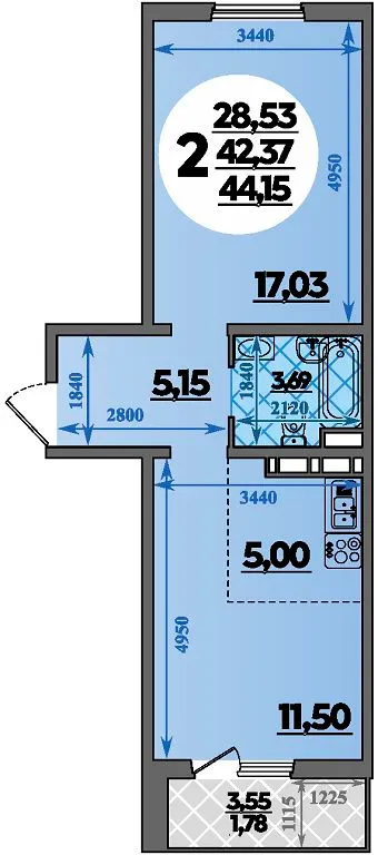 2-комнатная квартира 44.15м2 в ЖК Молодежный 2, №090