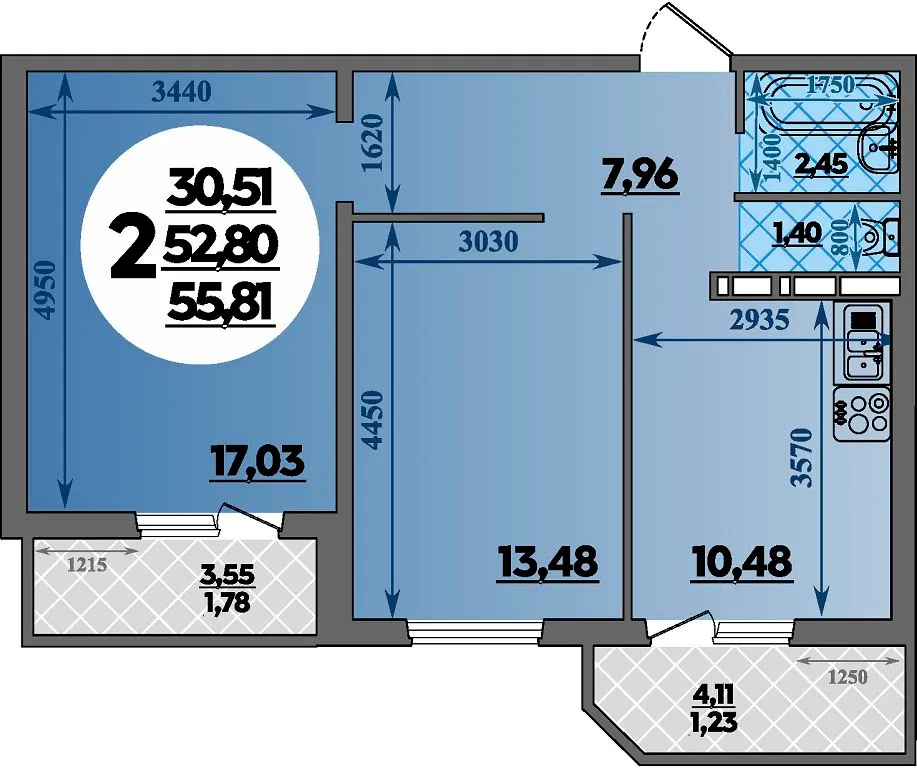 2-комнатная квартира 55.81м2 в ЖК Восточный, №001
