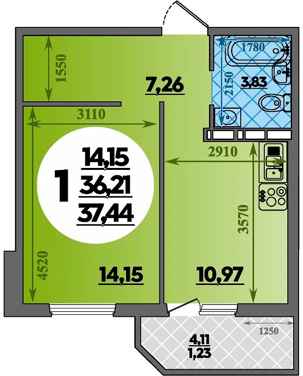 1-комнатная квартира 37.44м2 в ЖК Восточный, №252