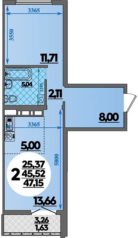 2-комнатная квартира 47.15м2 в ЖК Город у моря, №322