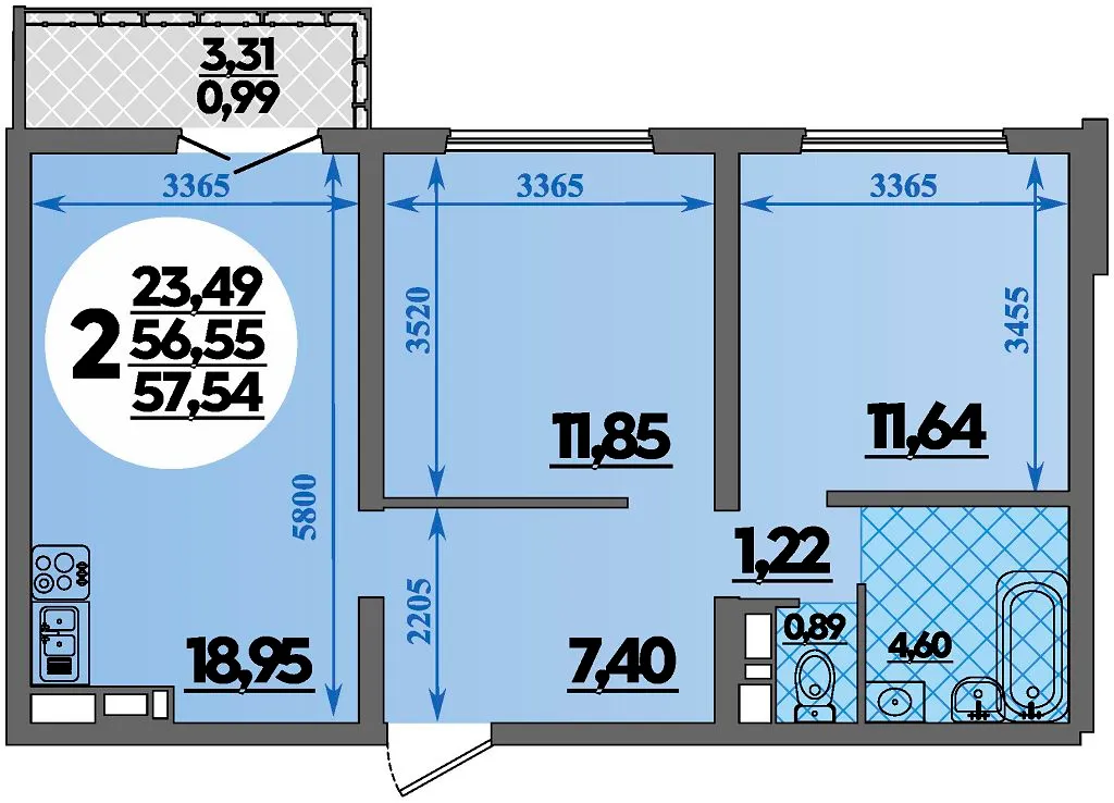 2-комнатная квартира 57.54м2 в ЖК Город у моря, №024