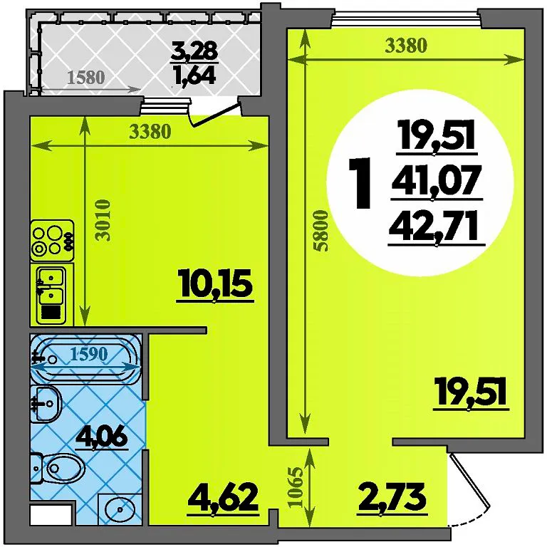 1-комнатная квартира 42.71м2 в ЖК Предгорье Лаго-Наки, №003