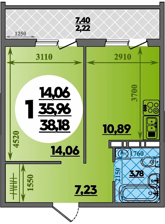 1-комнатная квартира 38.18м2 в ЖК Восточный, №015