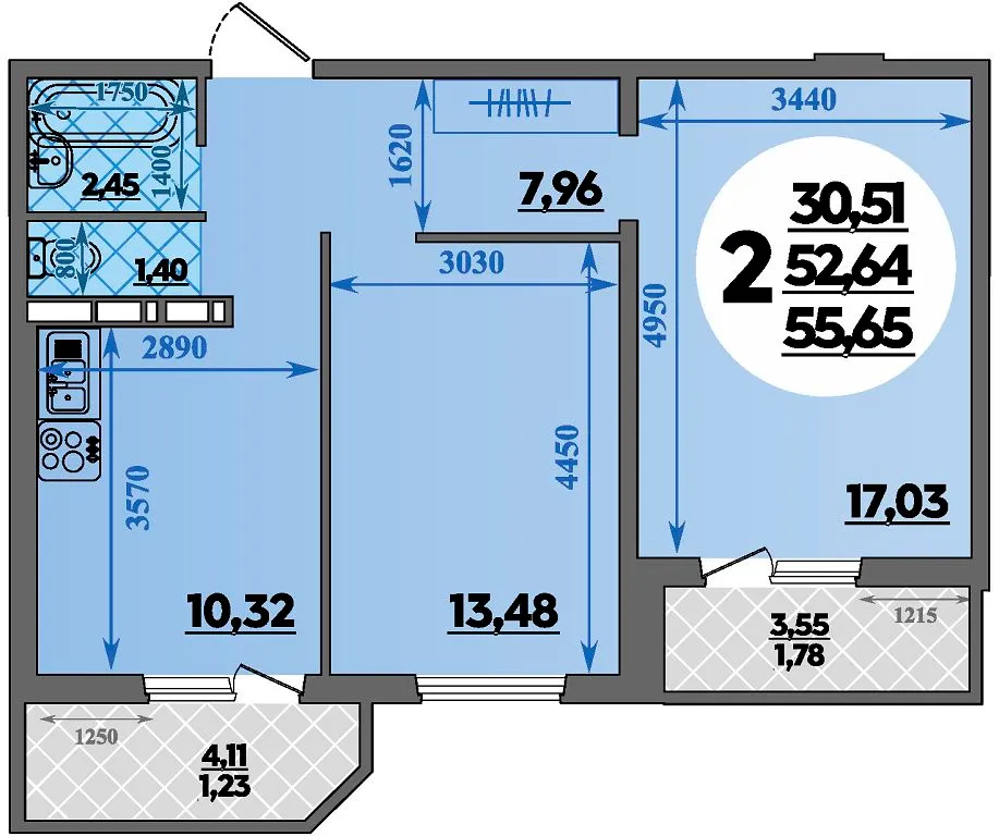 2-комнатная квартира 55.65м2 в ЖК Восточный, №024