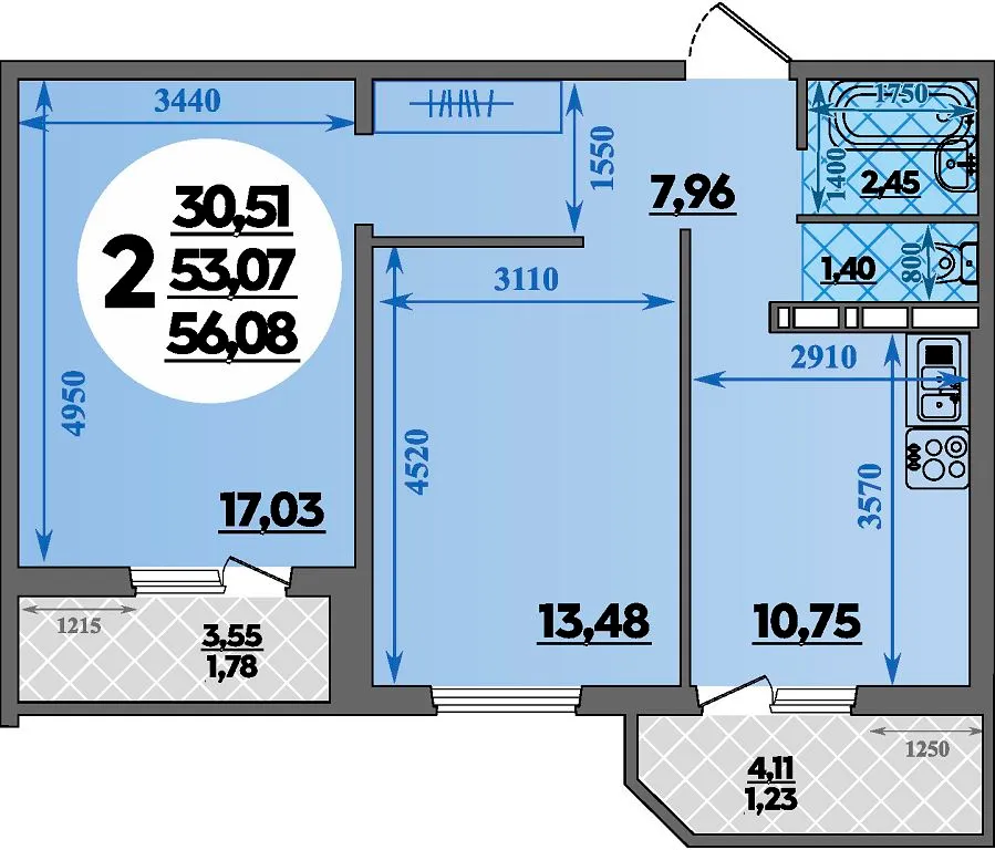 2-комнатная квартира 56.08м2 в ЖК Восточный, №226