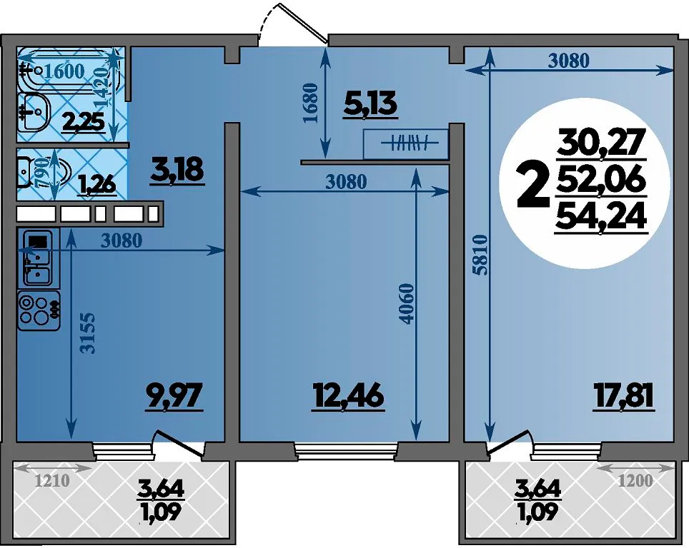2-комнатная квартира 54.24м2 в ЖК Платовский, №187