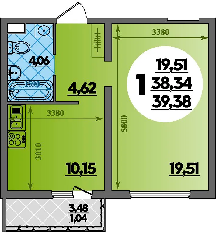 1-комнатная квартира 39.38м2 в ЖК Предгорье Лаго-Наки, №090